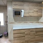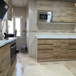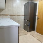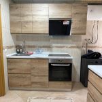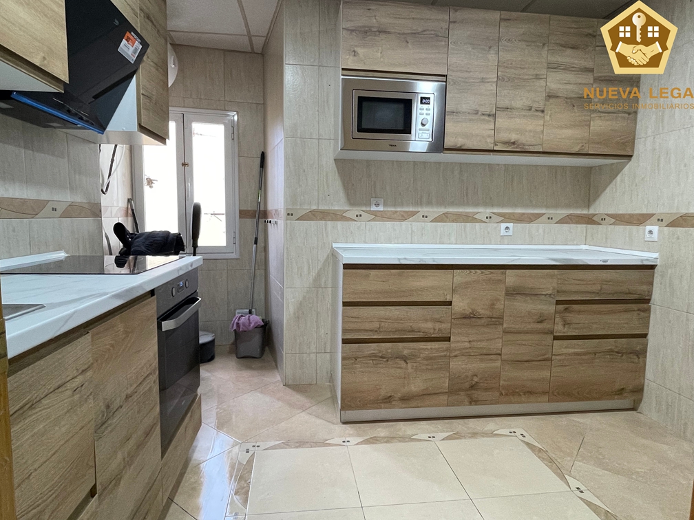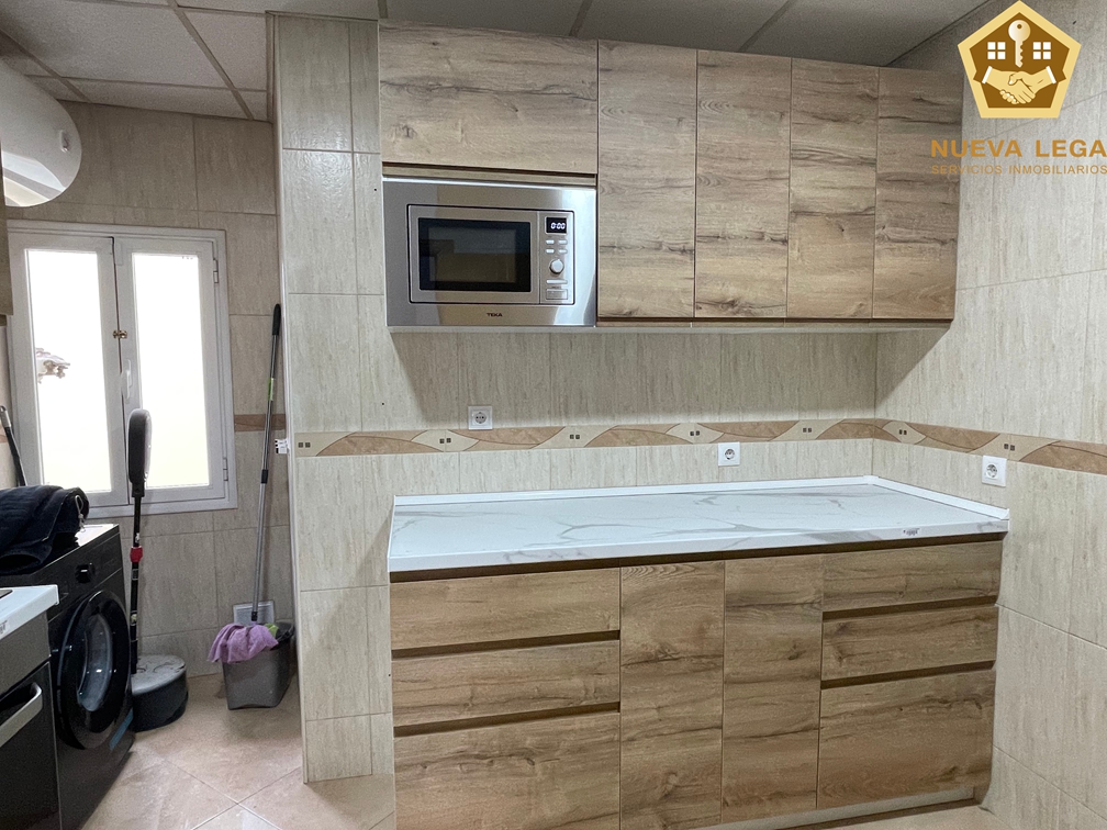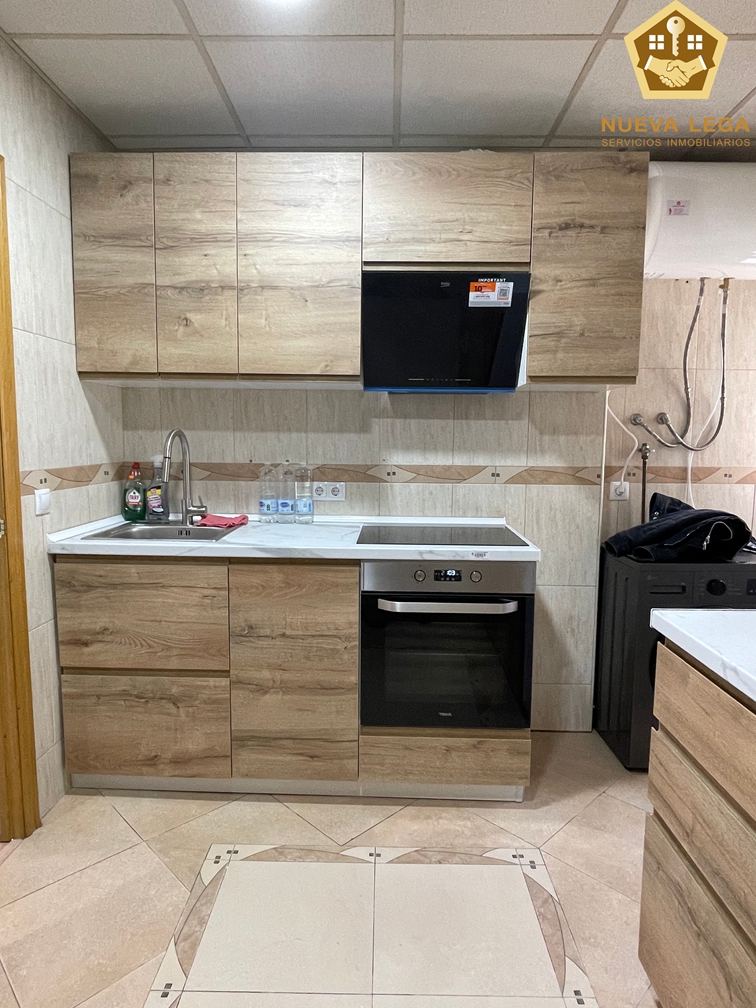 La cocina está recién instalada, con todos los mobiliarios y electrodomésticos nuevos.